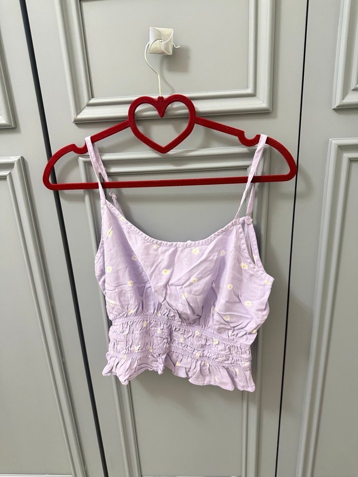 Lila pastel tonlarında, fırfırlı detaylı askılı mini bustiyer. Yumuşak keten kumaştan, bohem tarzına uygun rahat kesim.