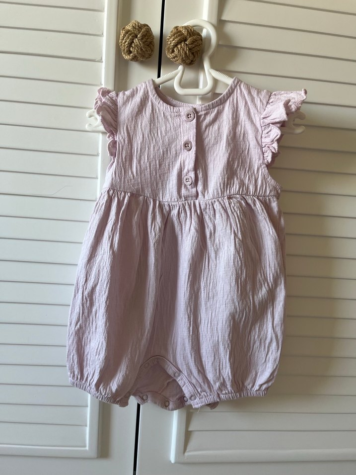 Yumuşak kumaştan yapılmış, düğme detaylı ve fırfırlı kollu pastel pembe bebek kız tulumu.
