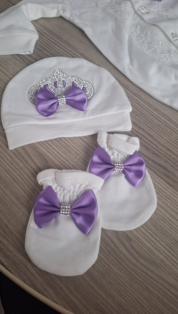 Beyaz şapka ve eldivenlerden oluşan bebek hastane kıyafeti, lila fiyonklar ve işlemeli detaylarla yumuşak ve zarif bir görünüm sunar.