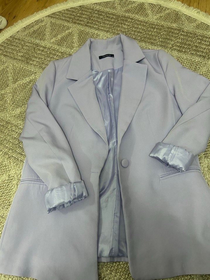 Lila renkli midi blazer, düğmeli ve kesik yaka detaylıdır. uzun kollu ve normal kesimdir. Ofis ve günlük kullanıma uygundur. 38 beden
