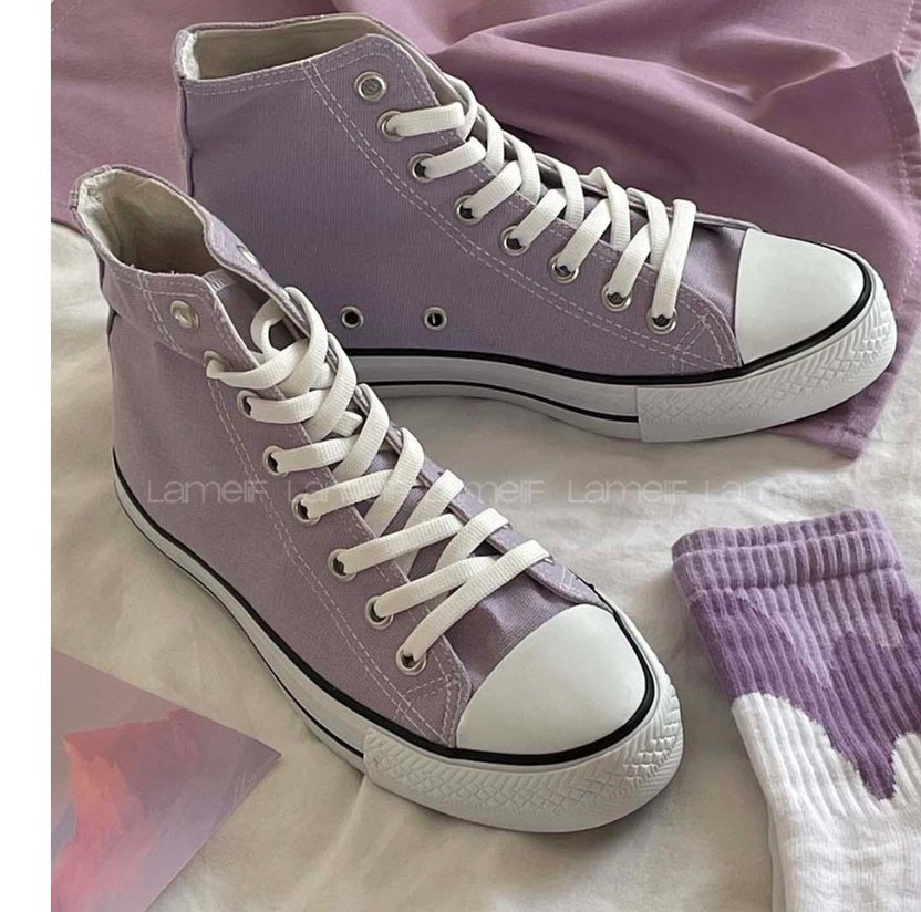 Lila yüksek top kadın spor ayakkabıları, beyaz bağcıklarla ve kauçuk tabanla günlük kullanım için rahat ve şık bir seçenek sunar.