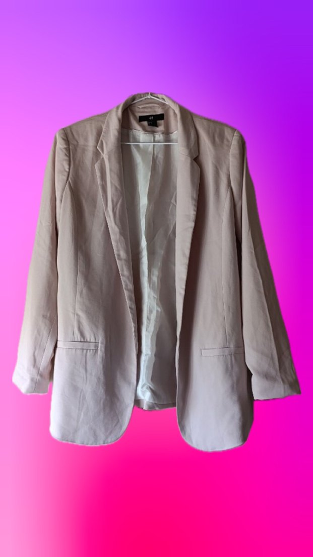 Bej renkli, ipeksi kumaştan kadın blazer. Uzun kollu, düğmeli ve normal boyda, ofis ve günlük kullanıma uygun.