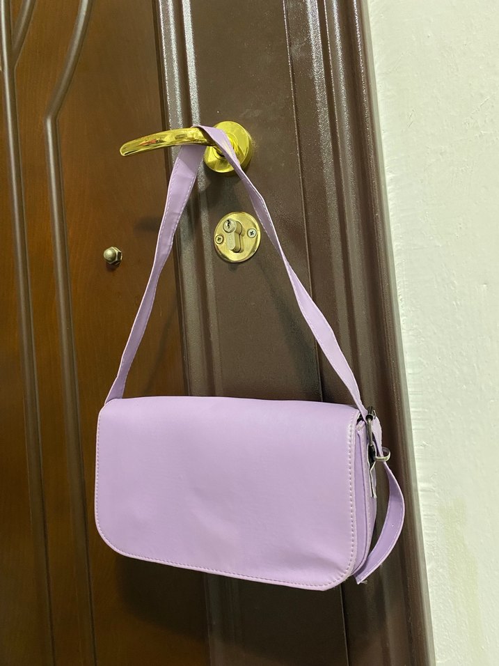 Az kullanıldı. önde gördüğünüz kısım el ile düzeltiliyor kolayca. Pastel mor renkte deri omuz çantası, tokalı askısı ve sade tasarımıyla günlük sokak modasına uygundur.