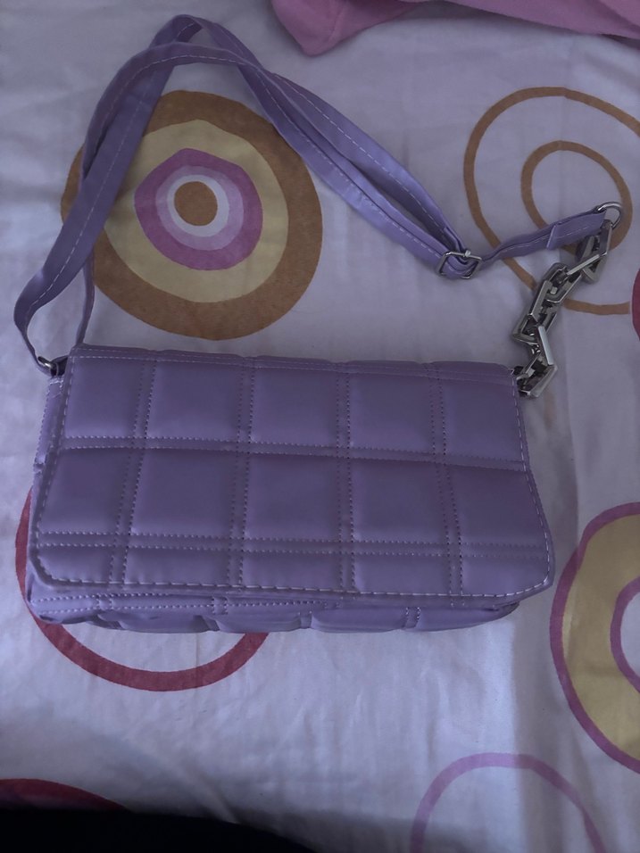 Yumuşak sentetik kumaştan, tokalı ve ayarlanabilir askılı pastel mor kadın omuz çantası. Günlük sokak stiline uygundur. Fotoğrafta mevcut olan zincirin bağlandığı kısım sökülmüştü ben dikiş bilmediğim için yapıştırdım çantacıda ve yahut dikiş bilen birisi çok rahat dikebilir