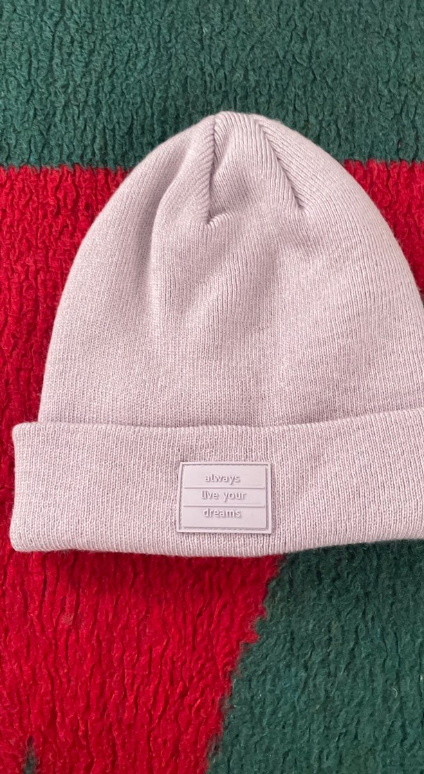 Bu pastel pembe kadın bere, örgü tasarıma ve yumuşak polar astara sahiptir, sıcaklık ve konfor sağlar. Üzerinde 'always live your dreams' yazan sade bir etiket bulunur.