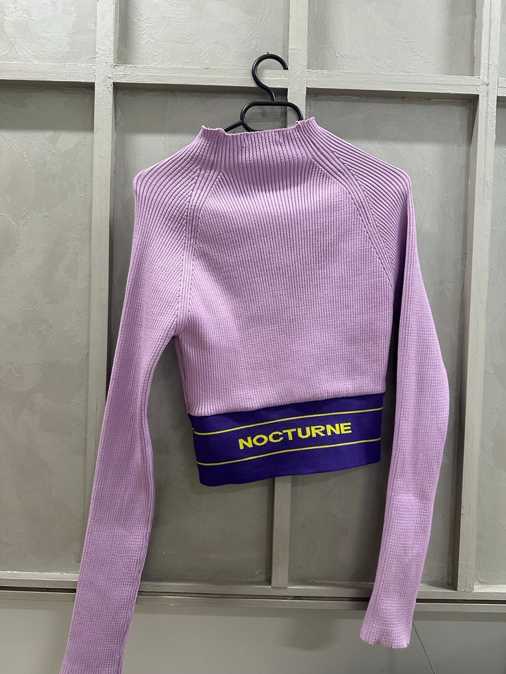 Lila renkli, balıkçı yakalı ve uzun kollu, ince örme kumaştan yapılmış, vücuda oturan triko kazak. Alt kısmında NOCTURNE yazısı bulunur.