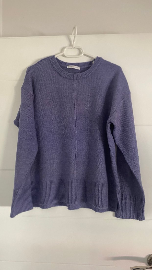Bu lila renkli triko kazak, yuvarlak yaka ve uzun kollu, bol kesim ile rahat ve sade bir tarz sunar. Normal boyda ve desensiz, günlük kullanıma uygundur.