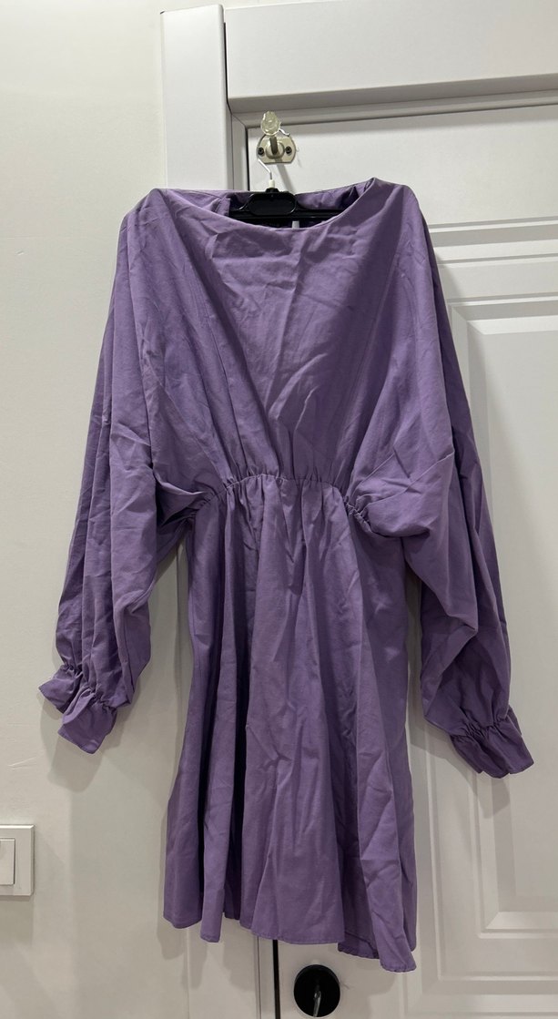 Lila renkte, keten kumaştan uzun, drapeli, uzun kollu ve yüksek yakalı rahat kesim elbisedir. Minimalist tarzıyla günlük kullanıma uygundur.