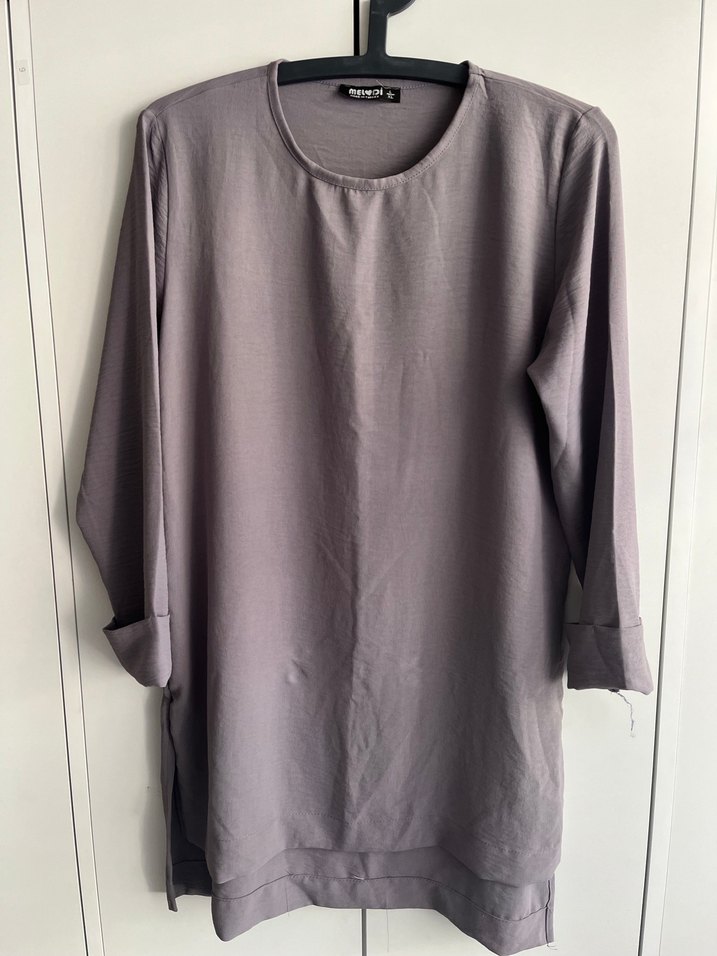 Lila renk, uzun kollu, yuvarlak yaka, salaş kesim kadın tunik, günlük kullanım için uygun. Defosuz