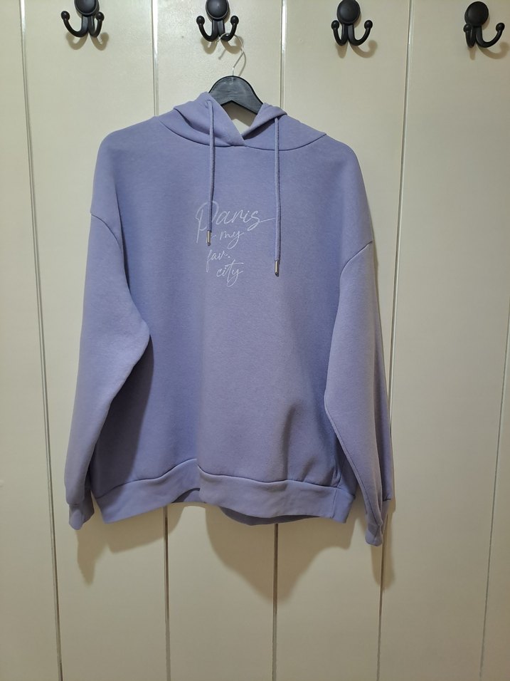 Pastel lila renkte, kapüşonlu ve uzun kollu, rahat kesim kadın sweatshirt. Önünde baskı deseni bulunur, yumuşak ve sıcak kumaştan üretilmiştir. iki kol arası 67 boy 69