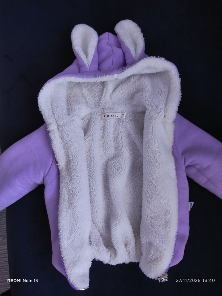 Pastel lila renkte, kapüşonlu ve sevimli kulak detaylı, içi yumuşak kürk astarlı bebek mont sayılı temiz ve sorunsuzdur.