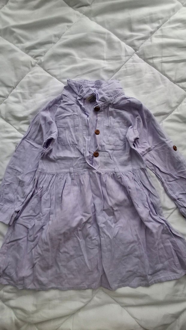 Pastel lila renkli, keten kumaştan, uzun kollu ve düğmeli yakalı kız elbisesi, rahat bol kesim sunar. 6-7 yaş. kullanılmamıştır.