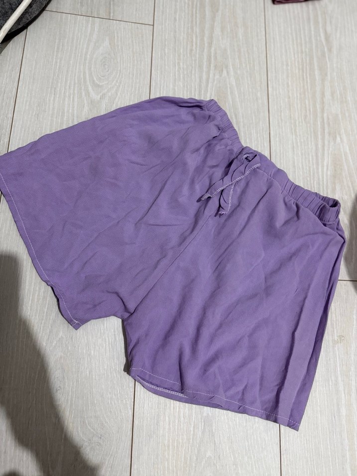 Lila keten, bol kesim hamile midi şort, bağcıklı bel detayıyla rahat ve bohem tarz sunar, açık hava için uygundur.