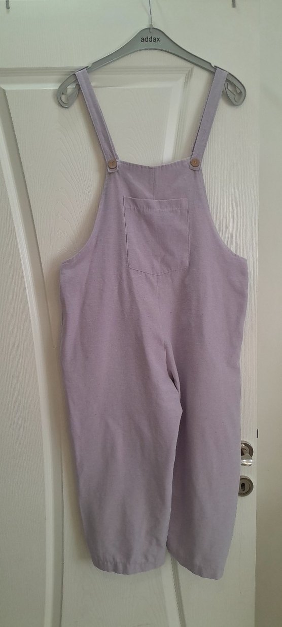 Yumuşak keten kumaştan yapılmış, rahat kesim ve kolsuz lila tulum, ön cep detayıyla sade ve şık bir görünüm sunar. bileklere kadar değildir kısa boyu ölçü sorabilirsiniz