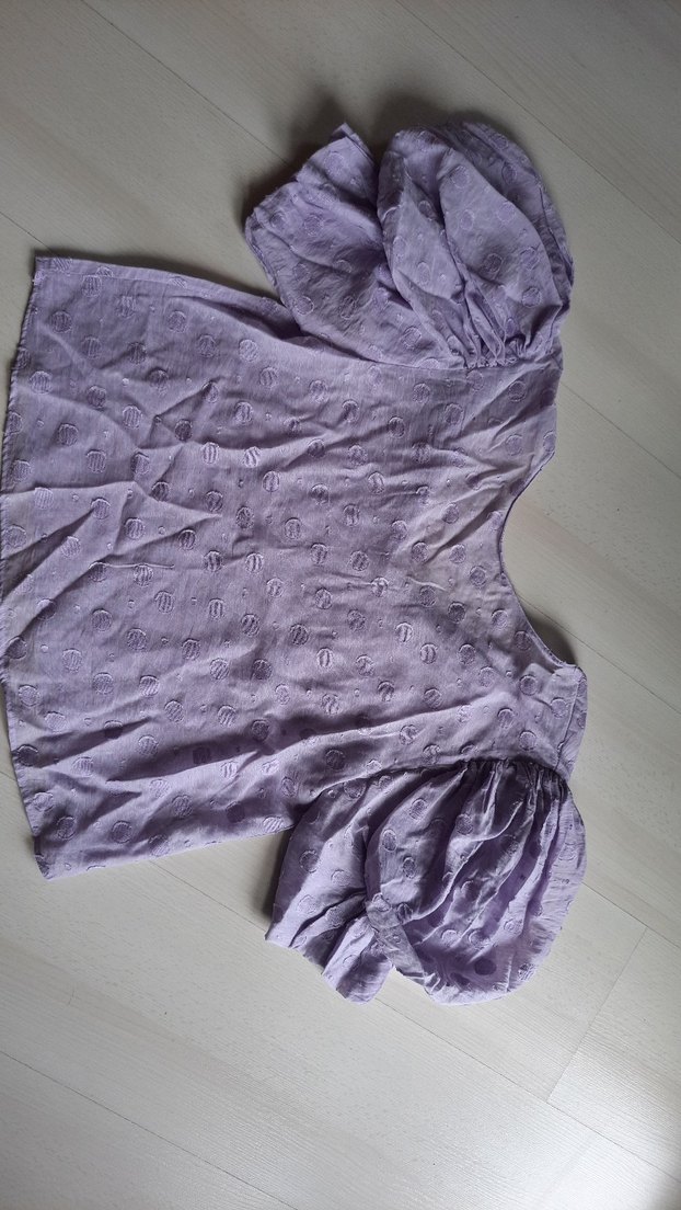 Lila keten kumaştan, V yaka ve salaş kesime sahip, kısa kollu, drapeli günlük bohem tarzda vintage bluz.