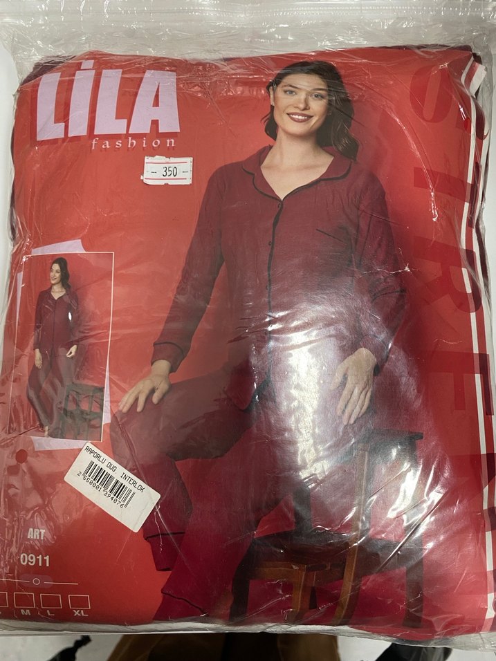 Lila markanın koyu kırmızı, uzun kollu, bol kesim kadın pijama takımı. Uzun boy ve rahat kumaşıyla konfor sağlar. S m l xxl bedenlerı vardır