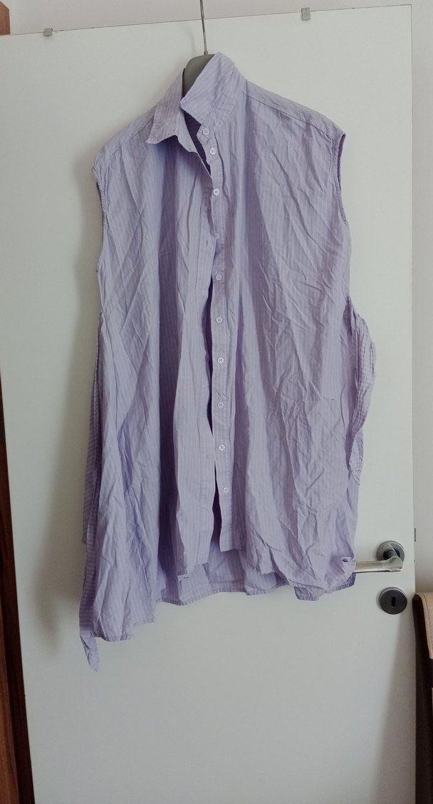 Lila renkli, kolsuz keten gömlek. Salaş kesim ve yakalı detaylarla günlük kullanıma uygun, midi boy ve desensiz minimal tasarım.