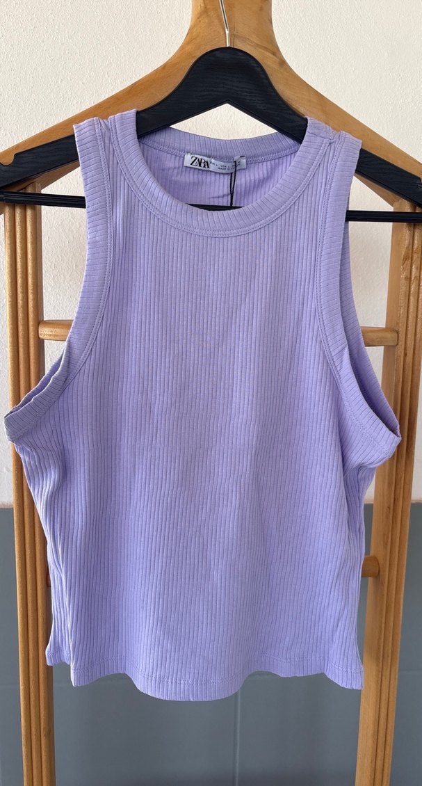 Lila renkte kolsuz, yüksek yakalı kadın atlet. Rahat kesim ve midi uzunlukta, yumuşak keten kumaştan üretilmiş, günlük spor şıklığı için ideal. M beden uyumlu
