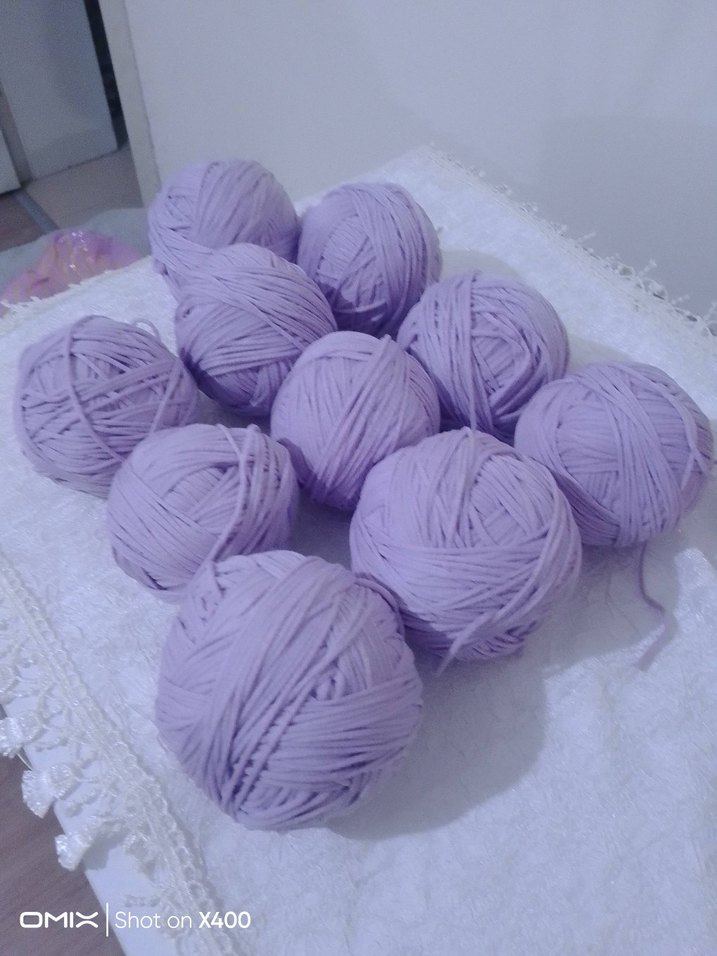 El işi için uygun, yumuşak dokulu on adet lila ip topu. Örgü ve tığ işleri için uygundur.