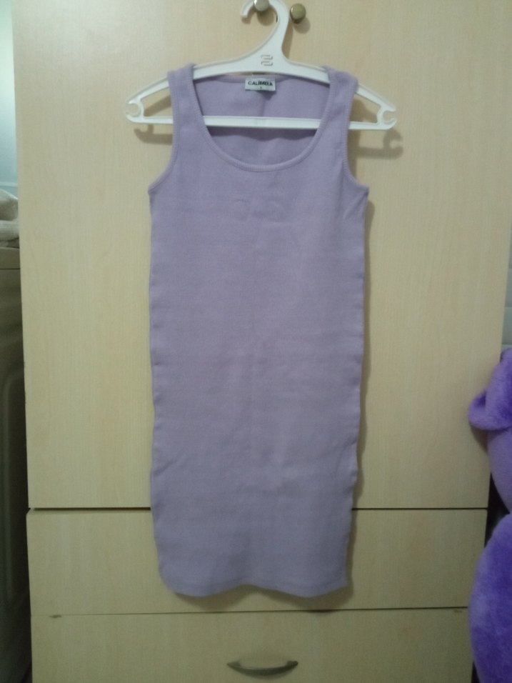 Lila pastel renginde, kolsuz, midi boy, dar kesim ve bisiklet yaka düz tasarımlı elbise. Rahat ve şık görünüm sağlar.
