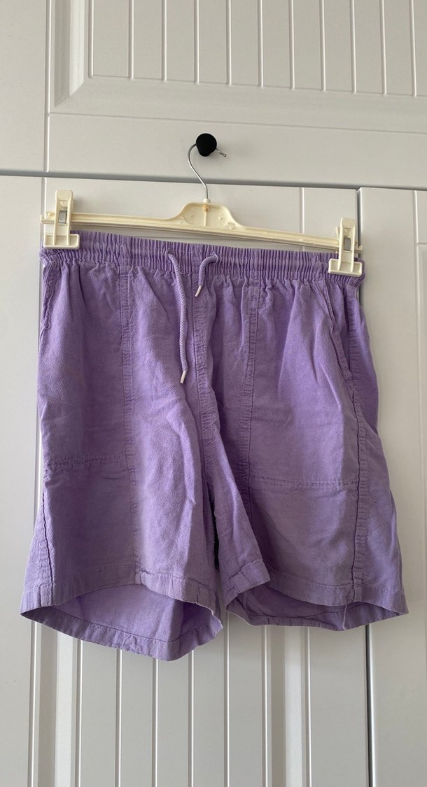Lila renkte, keten kumaştan, elastik bel ve bağcıklı, rahat ve salaş kesim hamile şortu. Günlük kullanıma uygundur.