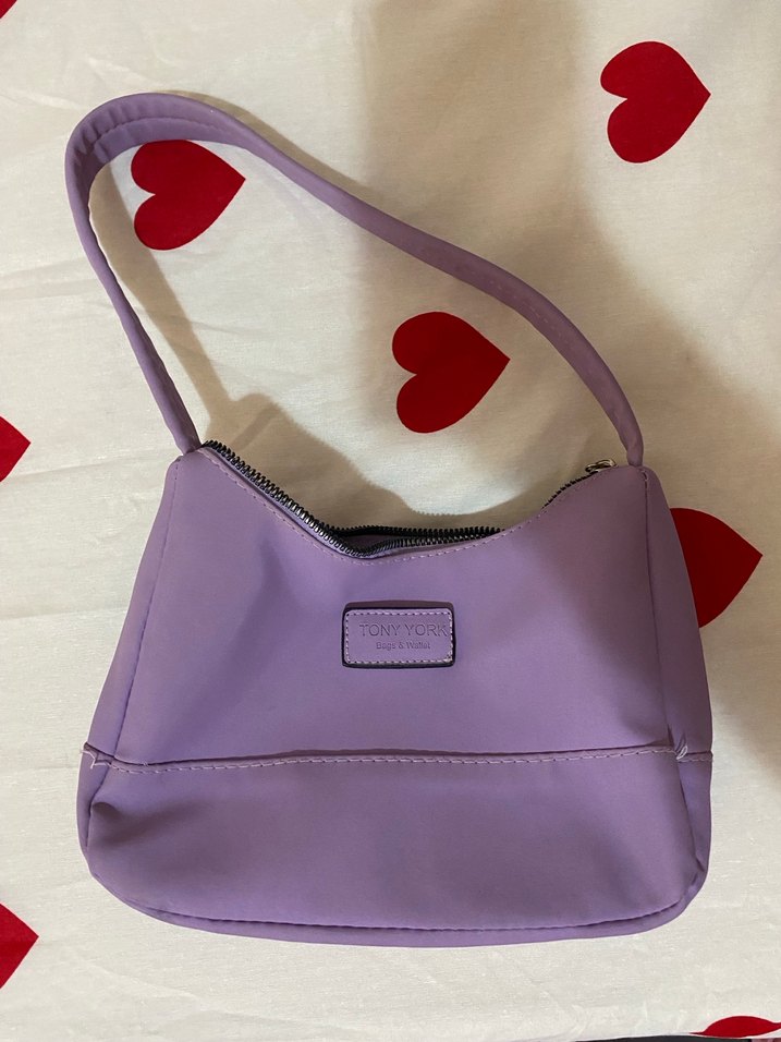 Lila pastel renkte, fermuarlı kapamalı, minimal tasarımlı, sentetik kumaştan yapılmış kadın omuz çantasıdır.