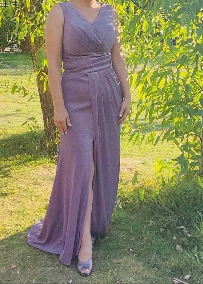 Soğuk tonda lila renk, yırtmaç detaylı, uzun abiye elbise, dar kalıp, biraz esneme payı var , 1 kez giyildi yepyeni
