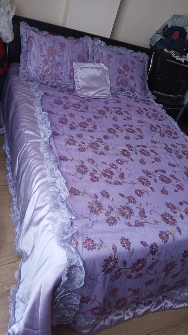 Pastel lila renkli, çiçek işlemeli ve fırfırlı kenarlara sahip yatak örtüsü. Uyumu sağlayan yastık kılıfları ile birlikte. hafif deforme olmuş yerleri var