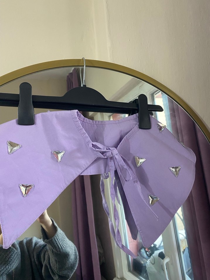 Nakışlı detaylara ve fiyonk süslemeye sahip, pastel lila renkte kedi yakası, streetwear tarzında.