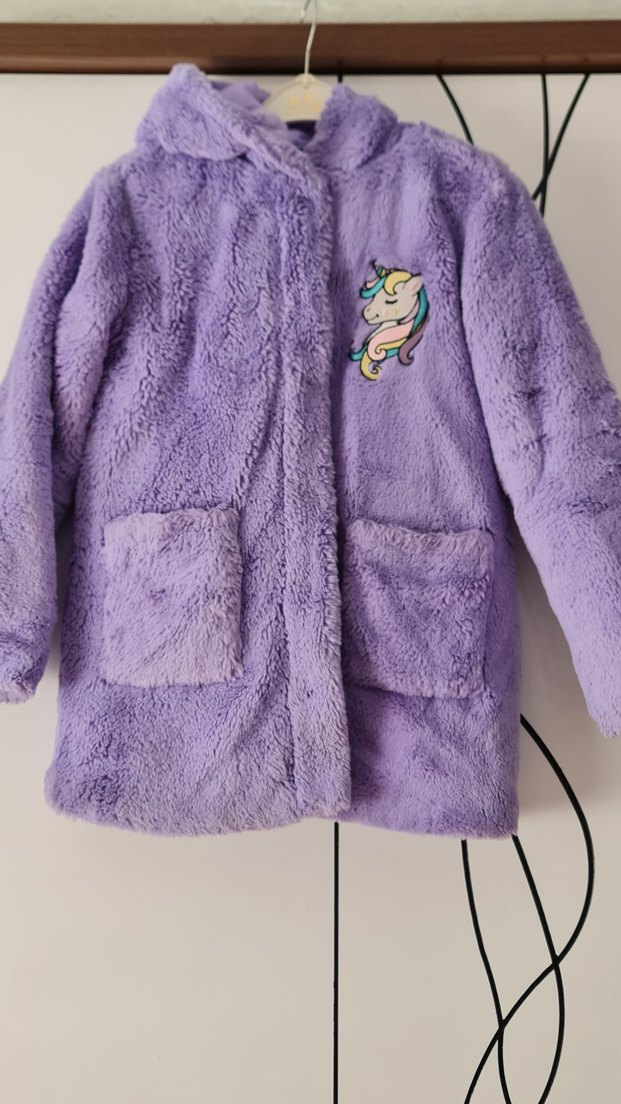 Lila renkte, nakışlı unicorn detaylı, kürklü ve geniş kesim kız kabanı, rahat sokak stili için uygundur.