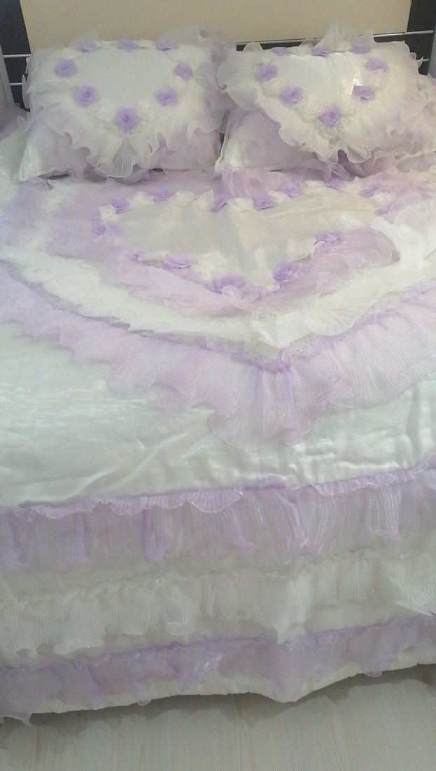 Pastel #lila renkte, #nakışlı ve #fırfırlı kenarlara sahip yumuşak dokulu &#yatak örtüsü. Kullanmak kısmet olmadı yine de kuru temizleme yaptırdım. Üründe herhangi bir sıkıntı yok.