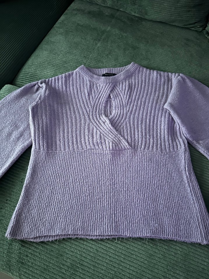Lila renkli, örgü dokulu, yuvarlak yakalı ve uzun kollu, vücuda oturan normal boyda kadın triko kazak. Rahat ve günlük kullanıma uygun. Göğüs dekolteli