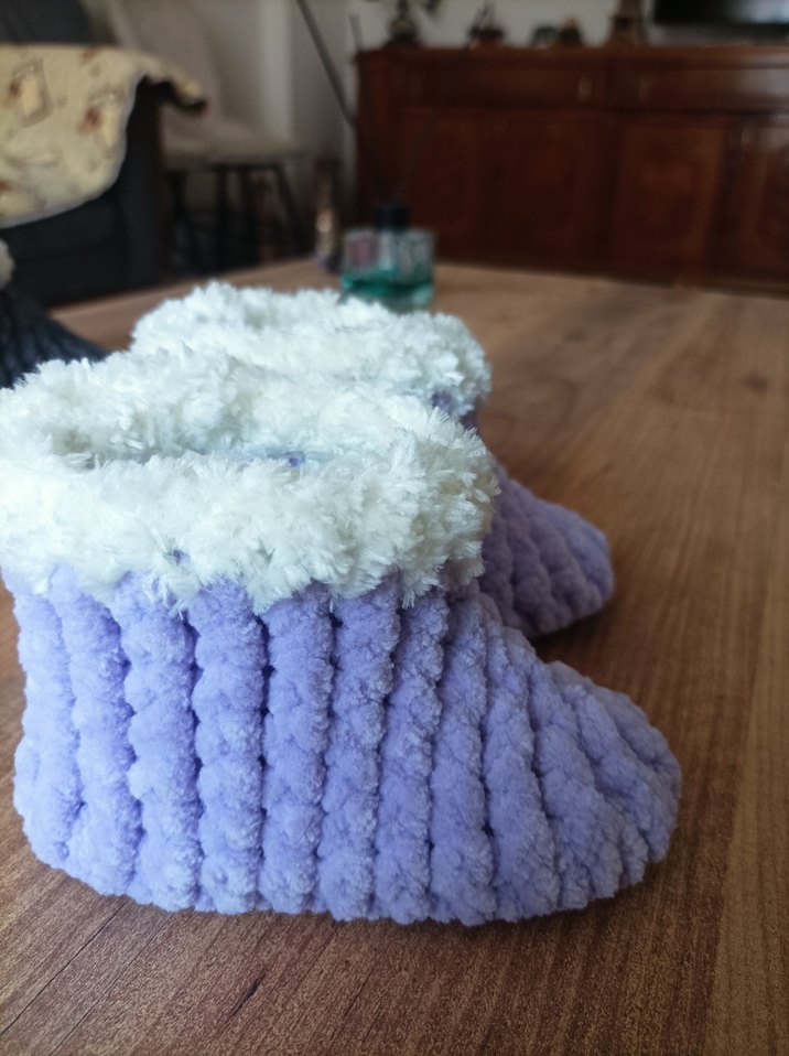 Lila renkli, örgü dokulu kız çocuk ev terliği, yumuşak ve tüylü iç kısmıyla sıcak tutar. 17-18 numaraya uygundur.