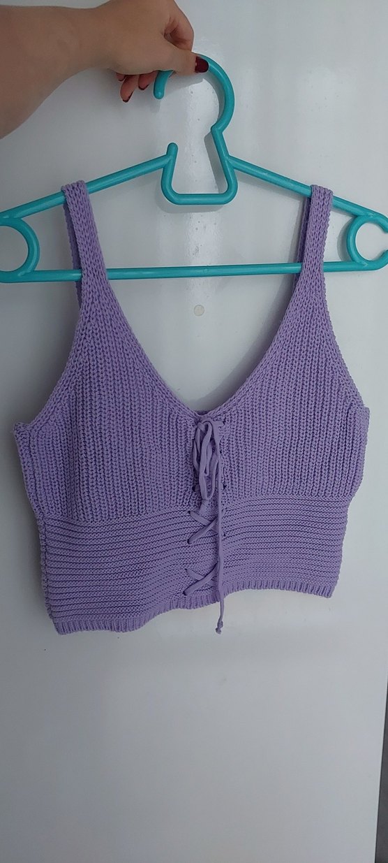 Lila renkli, V yaka ve askılı örgü crop top. Önden bağcıklı, kısa ve vücuda oturan tasarımıyla bohem tarzı yansıtır.