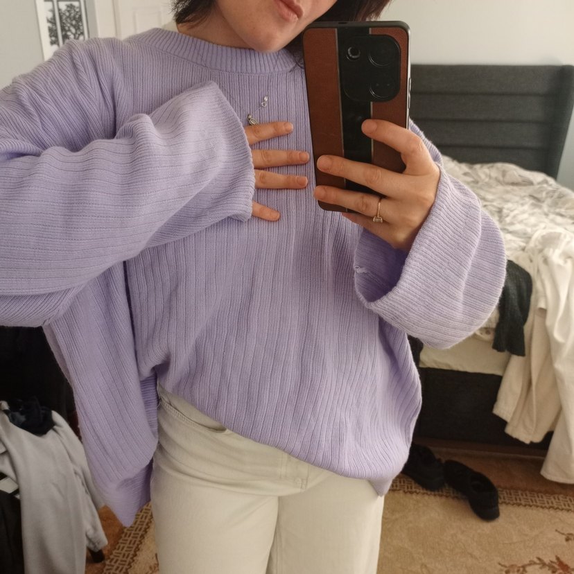 Pastel lila renkte, oversize kesim triko kazak. Yuvarlak yaka ve uzun kollu, rahat ve yumuşak dokulu, günlük sokak stiline uygun bir parça.