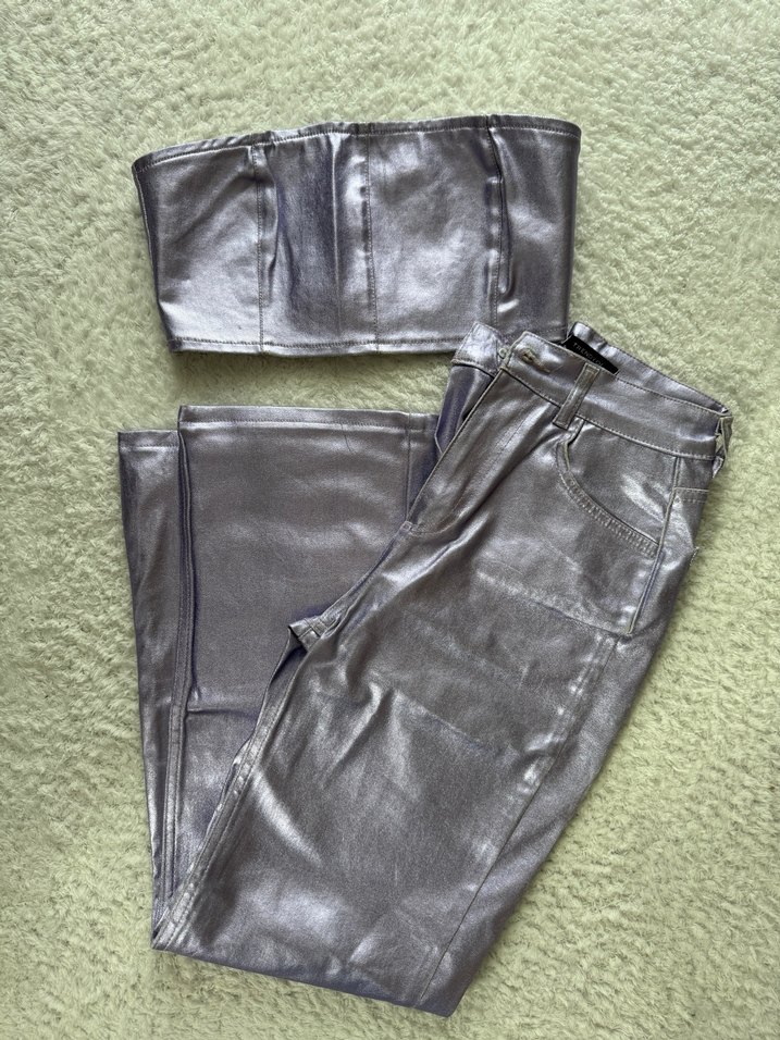 lila parlak Deri Kadın Pantolon takım