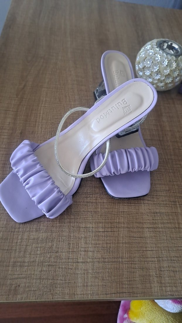 Lila pastel renkte, pilili detaylı ve blok topuklu kadın abiye #terlik Kauçuk malzemeden üretilmiş, düğün ve özel anlar için çağdaş ve şık bir tasarıma sahiptir.