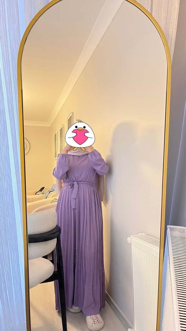 Lila pastel renkli bu uzun elbise, yüksek yakalı, askılı kollu ve bol kesimdir. Piliseli, ipeksi kumaşı ve sade tasarımıyla günlük kullanıma uygundur.