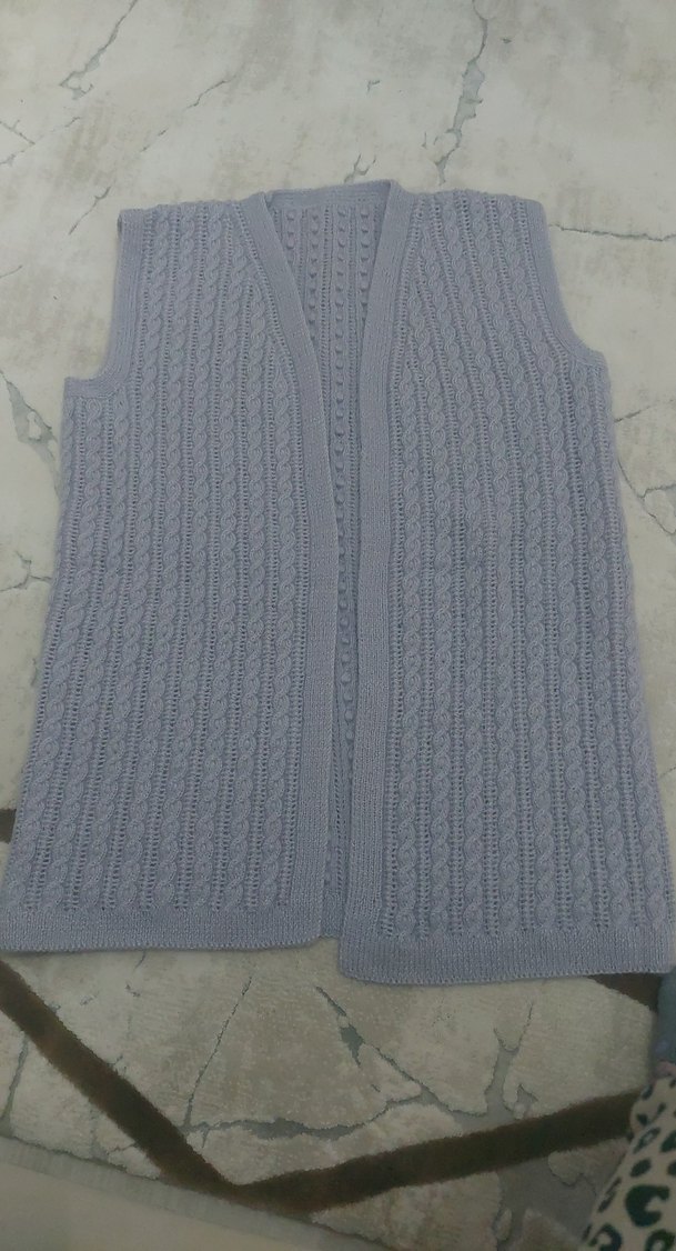 Gri örgü, V yaka ve kolsuz tasarıma sahip, rahat kesimli kadın süveter. Orta uzunlukta ve konforlu dokusu günlük kullanıma uygundur. hiç kullanılmadı.