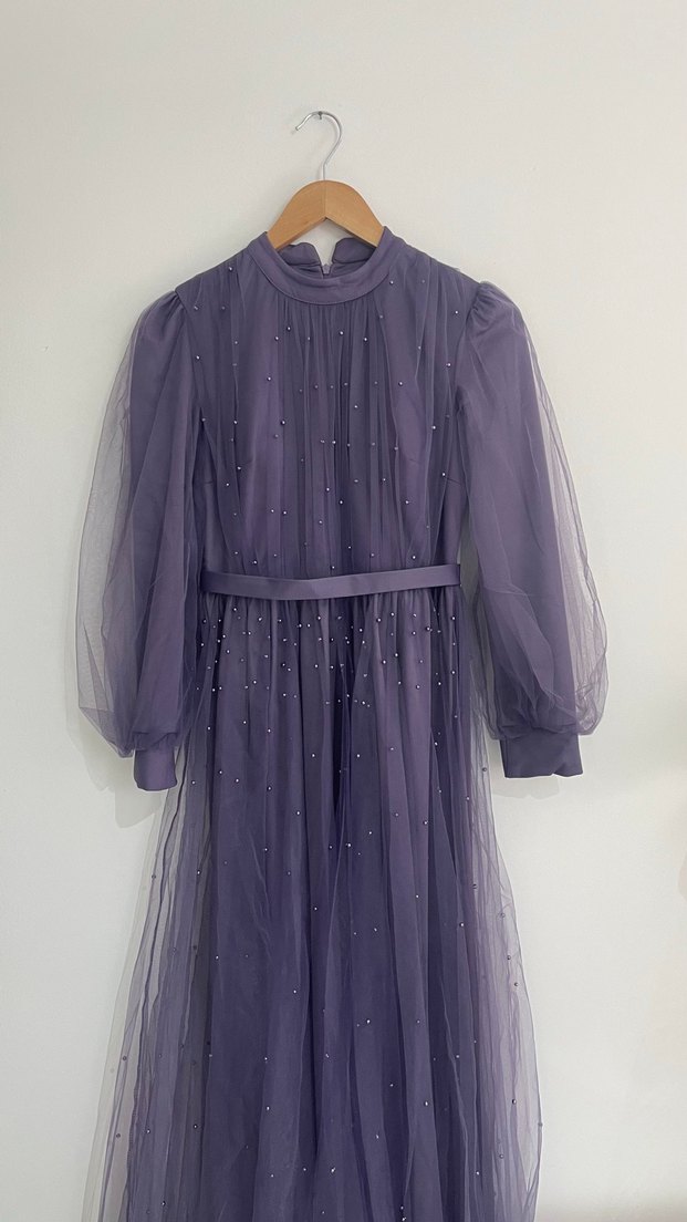 Lila rengi taşlı elbise, bir kez giyildi hiç bir defosu yoktur sorularınız varsa yardımcı olurum