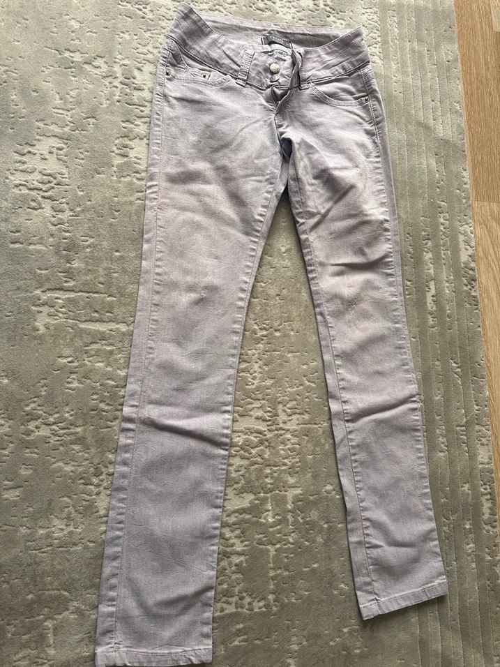 Lila renkli, düğmeli, normal boyda ve regular fit kadın denim pantolon. Sade ve desen içermeyen sokak stili için uygun. Keten-yeni kullanılmadı,yıkandı sadece. ❗️❗️** fotoğrafın ışığından dolayı renkler net çıkmamış tam lila yeni-renk soluk değildir.. 36 beden- S