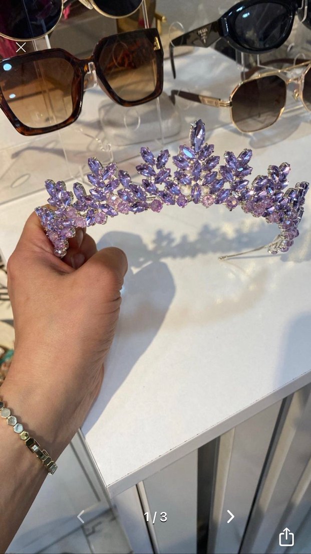 Mor pastel tonlarda, payetlerle süslenmiş, gösterişli ve avangart düğün tacı, moda öncülerine uygun. Nişanım için almıştım sadece bir kez kullanıldı lila renk