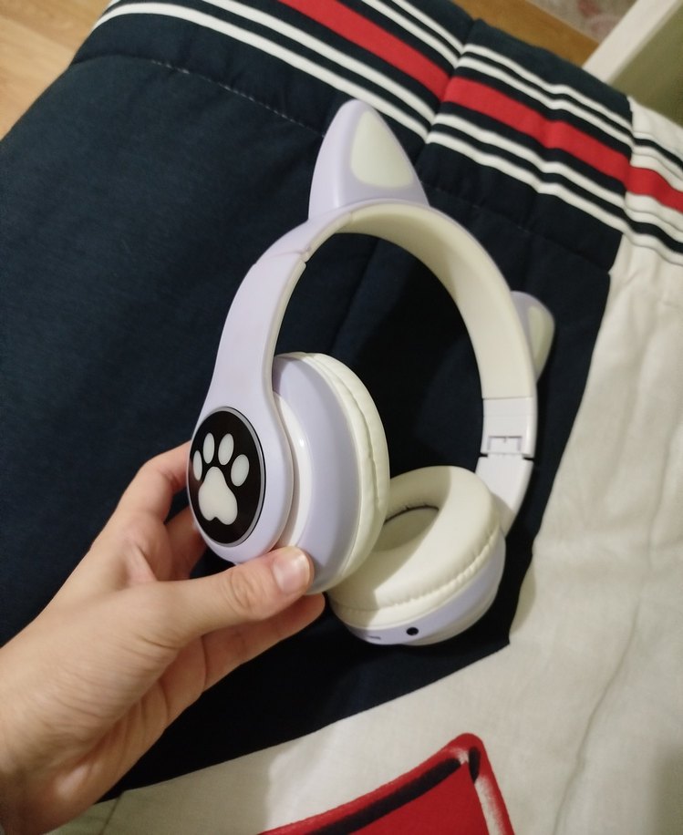 Yumuşak kulak pedlerine ve yan tarafında pati desenine sahip lila renkli,kedi kulaklı renkli kulaklık. ışıkları rengarenk yanıp sönüyor şarkı dinlediğiniz zaman