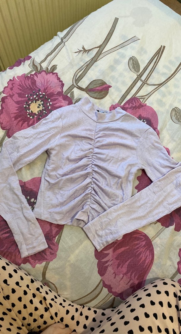 Keten kumaştan yapılmış, uzun kollu ve yüksek yaka, büzgülü detaylara sahip gri kız bluzu. Trendy sokak stili için uygun.