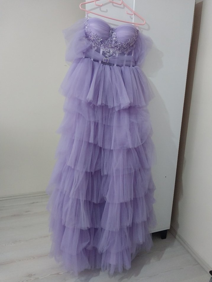 Lila renkli tüllü nişan veya düğünde giyebileceğiniz bu elbiseyi sadece 1 kez giydim. Prensesler gibi hissettiren bu elbiseyi satın alabilirsiniz fiyat net.