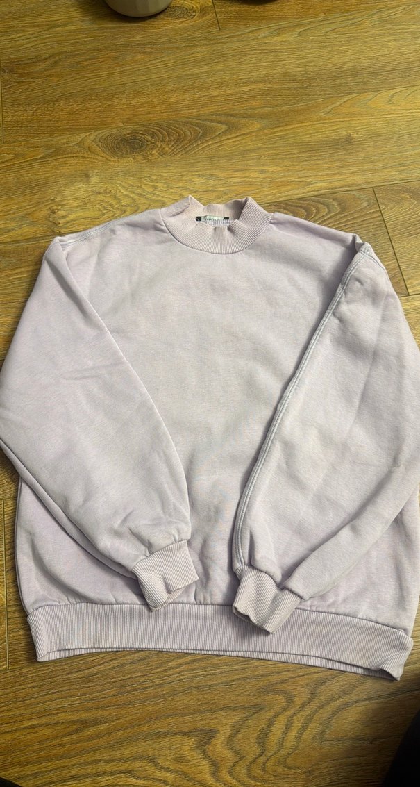 Lila renkli kadın sweatshirt uzun kolludur. Sol kolunda belli belirsiz bir leke var resimde mevcut onun disinda kusuru yok ici sardonlu.
