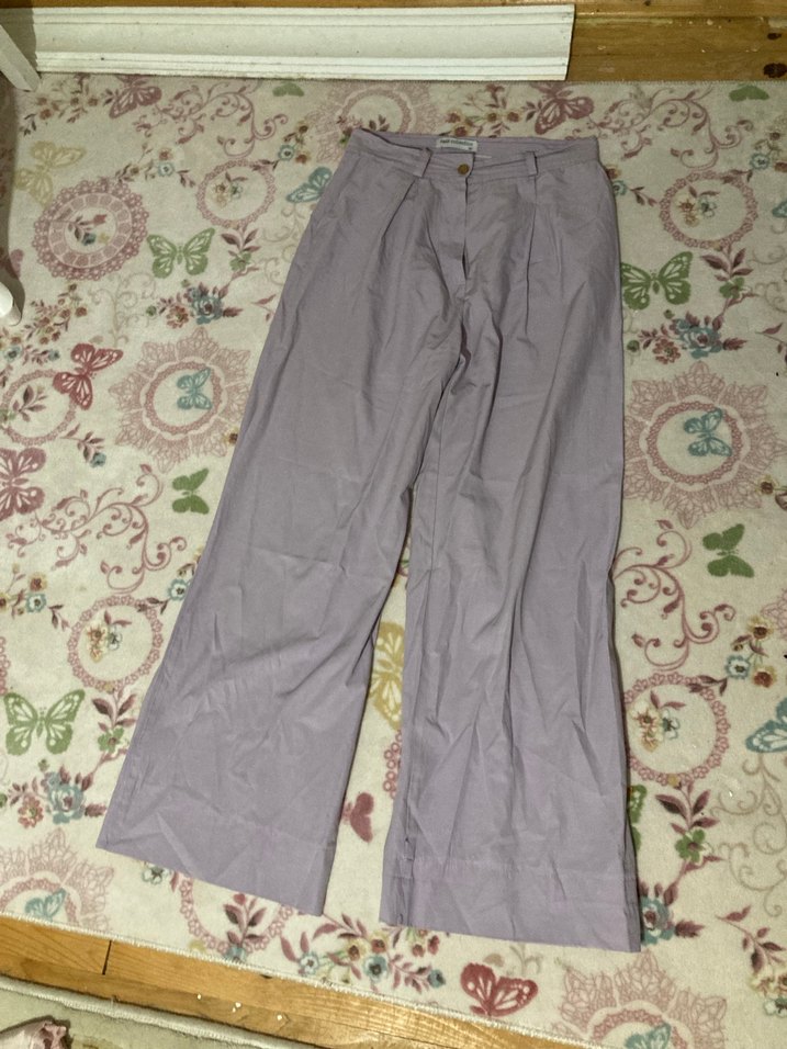 Lila renkte, sentetik kumaştan, bol kesim ve pilili tasarıma sahip midi boyda normcore tarzda kadın pantolonu. 100 cm boy Bacaginda katlamali dikisleri vardi ben soktum istenirse tekrar dilikebilir