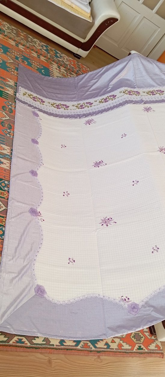 Pastel lila renkte, çiçek işlemeli kaneviçe pikedir yatak odanıza zarif ve yumuşak bir dokunuş katar.pamuklu ister yatak örtüsü istek pike olarak kullanılır çift kişiliktir, iki adet işlemeli yastığı var yastıklar pamuklu, kılıfı da mevcuttur fotoğrafta var