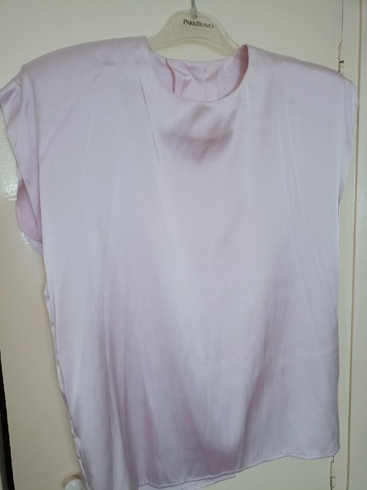 Lila saten kumaştan, kolsuz bluz. Yuvarlak yaka ve normal midi boyda, günlük kullanım için minimal ve şık.Sadece bir gece giyilmiştir.