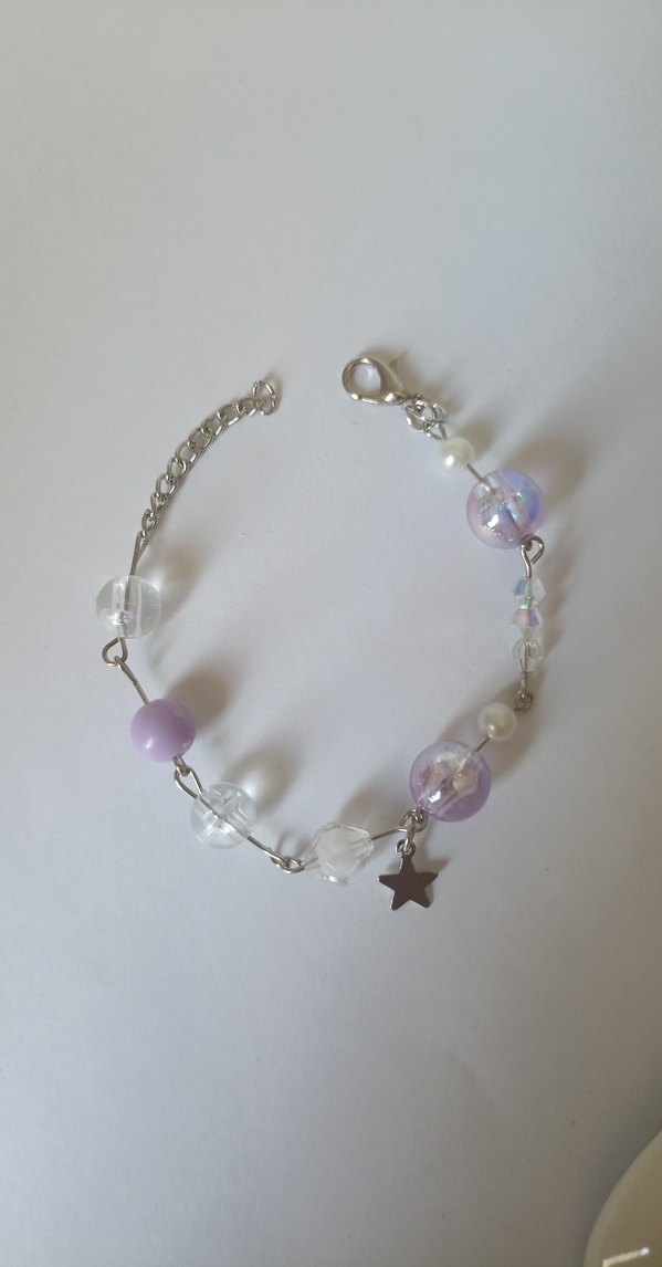 lila ve şeffaf boncuklar ile süslenmiş, gümüş yıldız charm detaylı kadın bileklik.